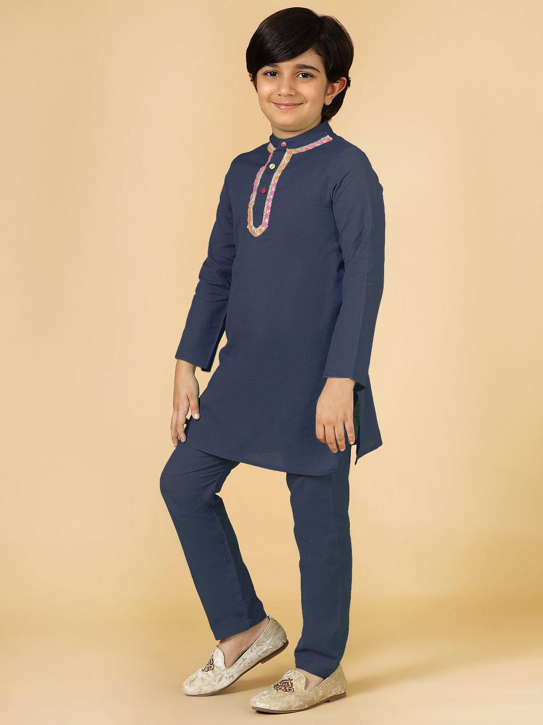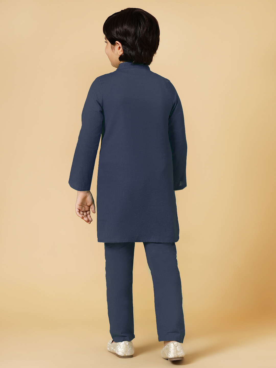 One of a kind style for your little boy! This Kurta Pyjama Set designed by A.T.U.N. is the perfect Indian wear for him. A stylish silhouette teamed with the perfect details adds to its style quotient. Making it a must-have occasion for him to wear.