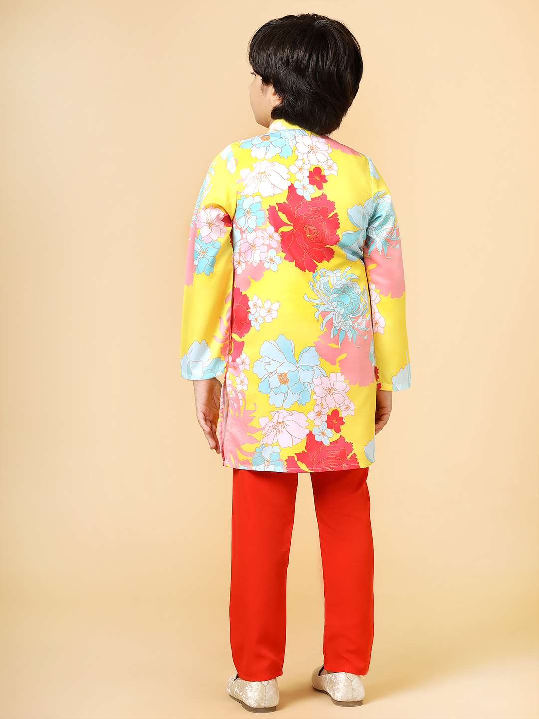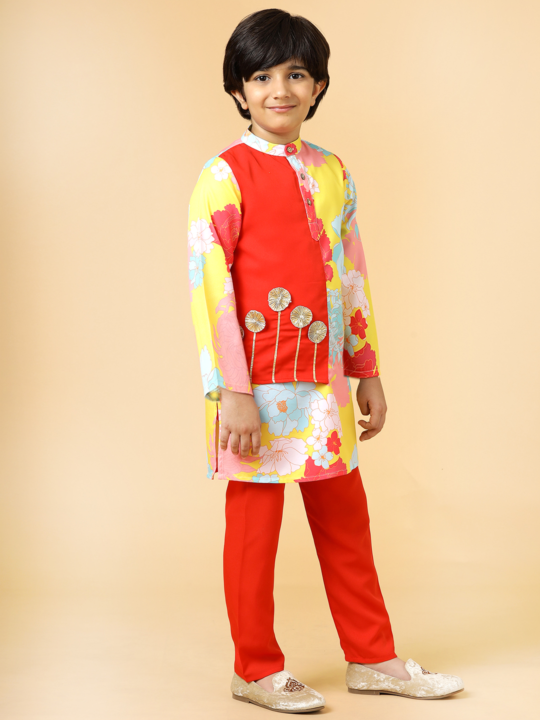 A.T.U.N. Boys’s Yellow-Red Floral Patch Kurta Pyjama Set