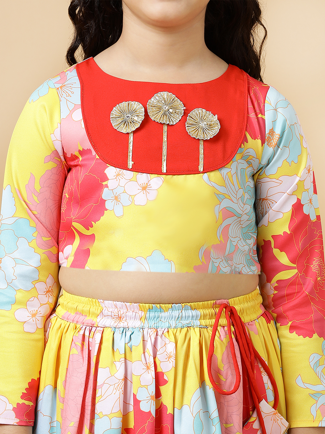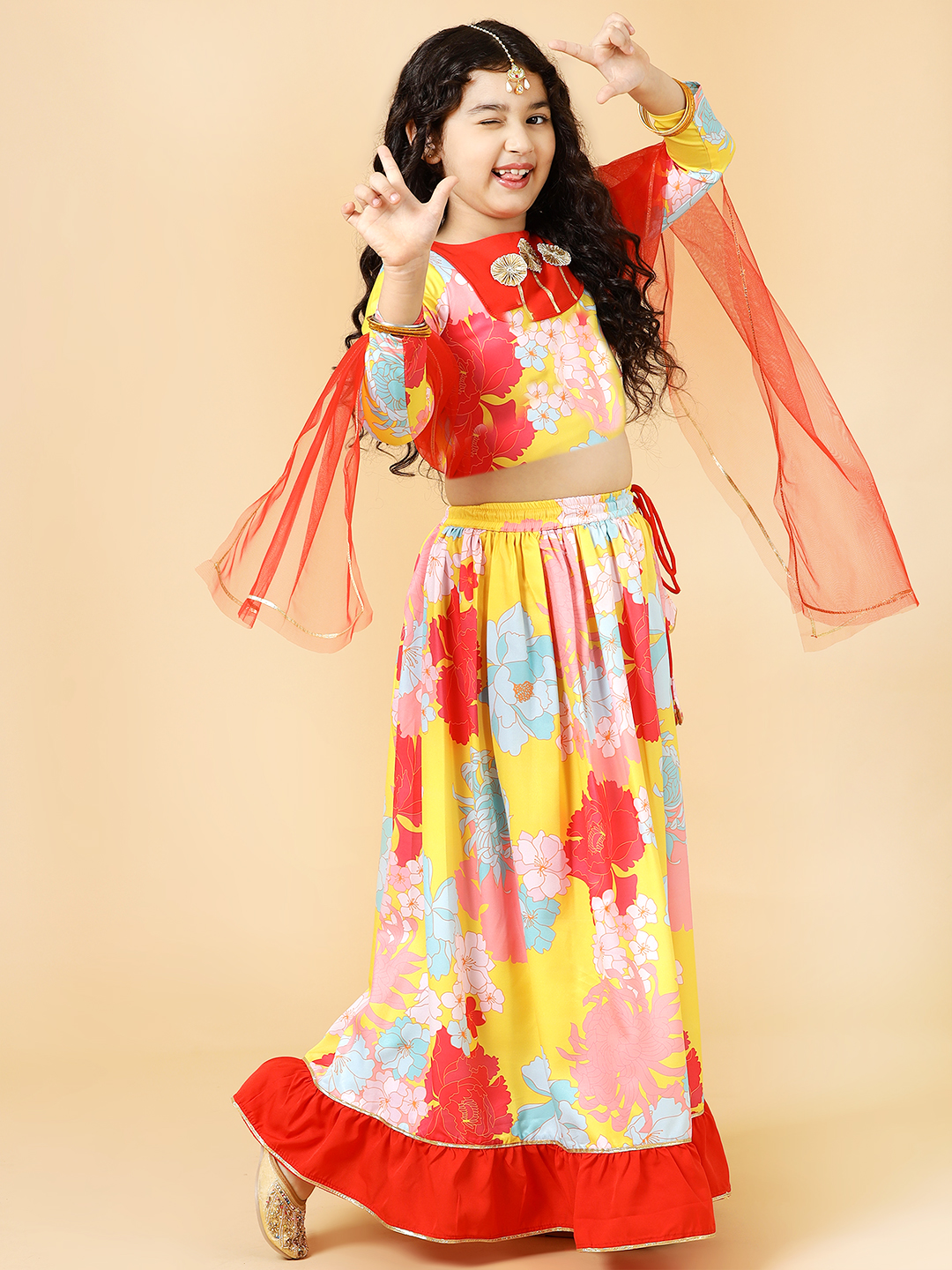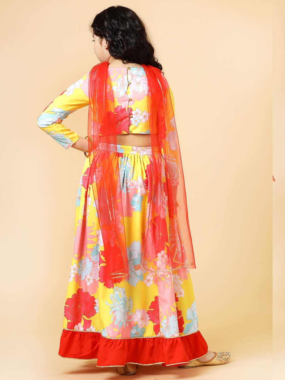 A.T.U.N. Girl’s Yellow-Red Floral Patch Lehenga Set