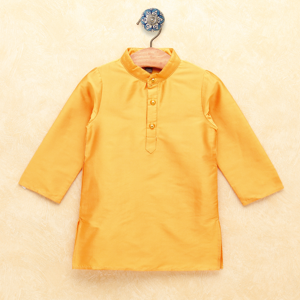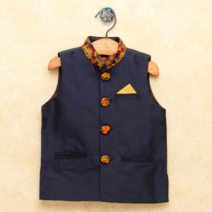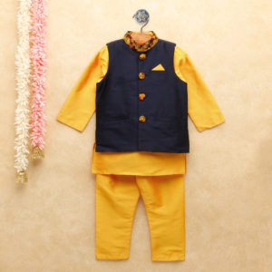 One of a kind style for your little masters! This Kurta-Pants-Jacket set designed by A.T.U.N. is the perfect Indian wear for him. Stylish Nehru Jacket with embroidered collars enhance the look and the taffeta pocket square adds style quotient . And a pair of straight pants that completes the look of the style making it a must-have occassion wear for your little boy.