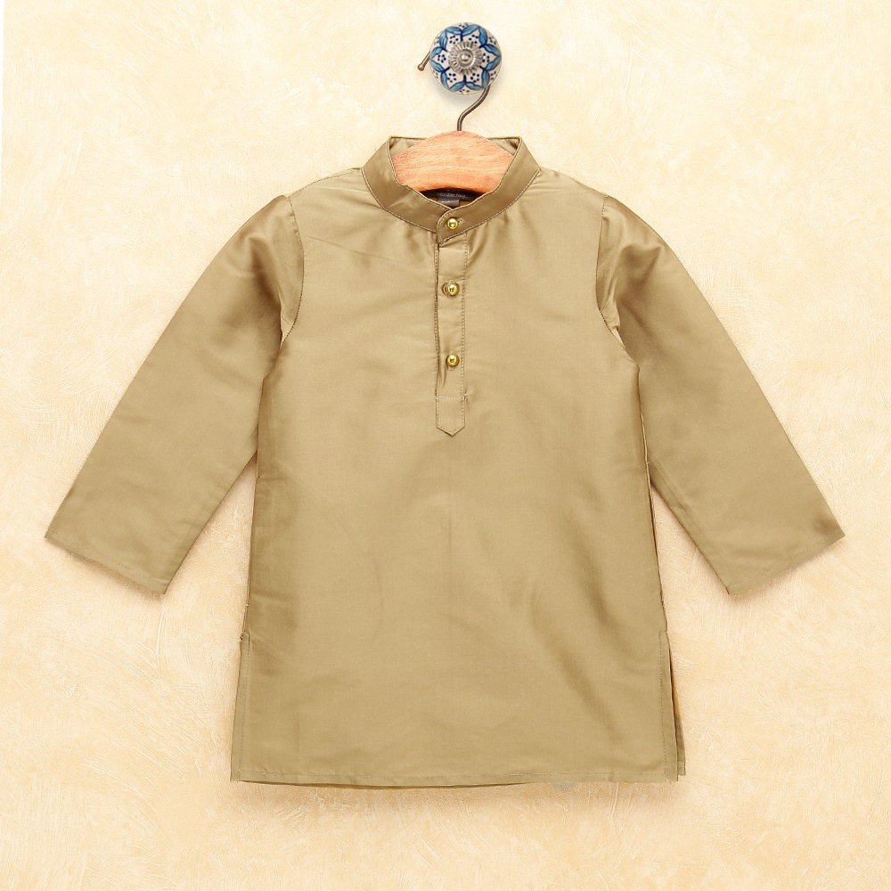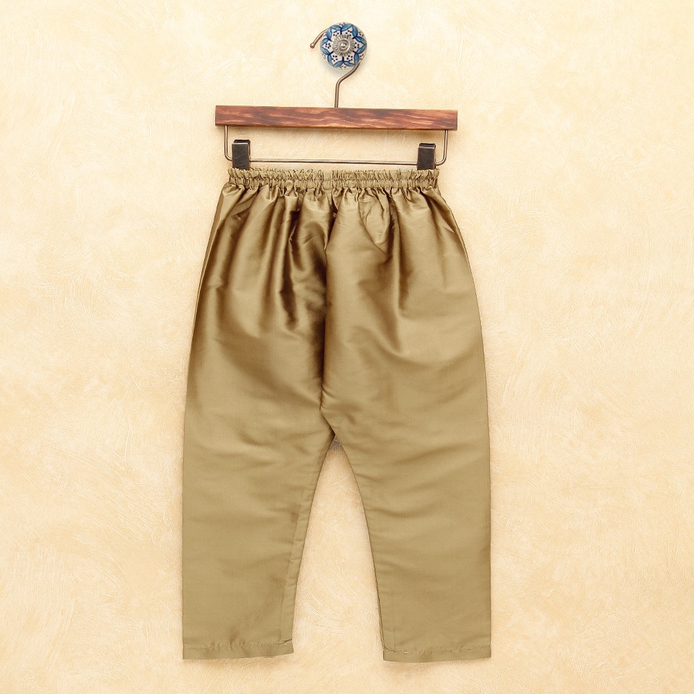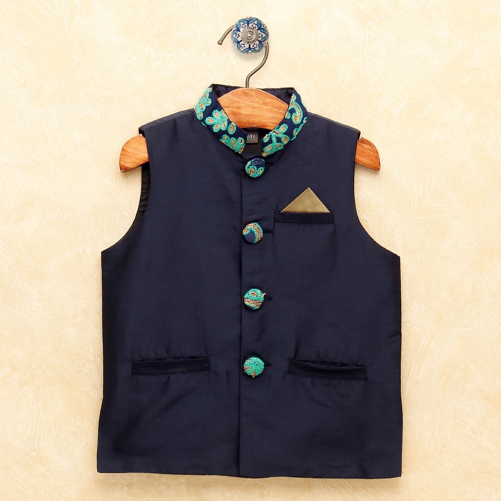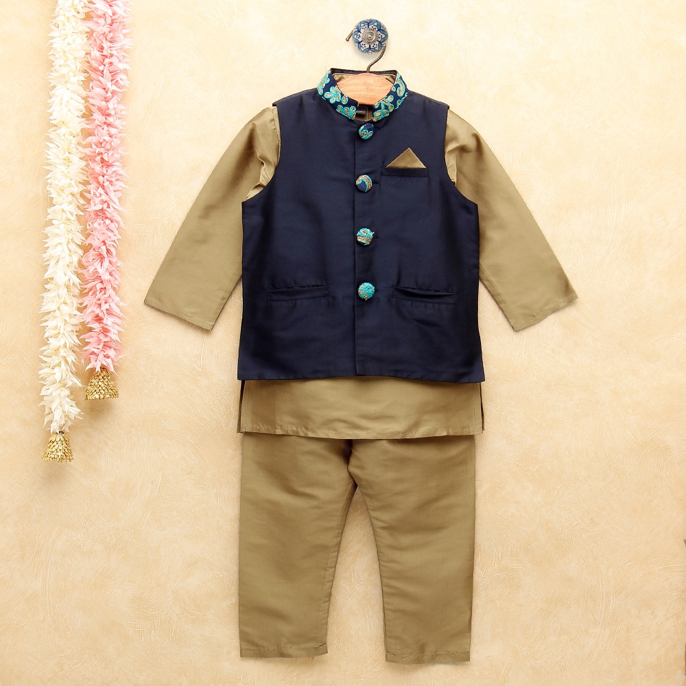 One of a kind style for your little masters! This Kurta-Pants-Jacket set designed by A.T.U.N. is the perfect Indian wear for him. Stylish Nehru Jacket with embroidered collars enhance the look and the taffeta pocket square adds style quotient . And a pair of straight pants that completes the look of the style making it a must-have occassion wear for your little boy.