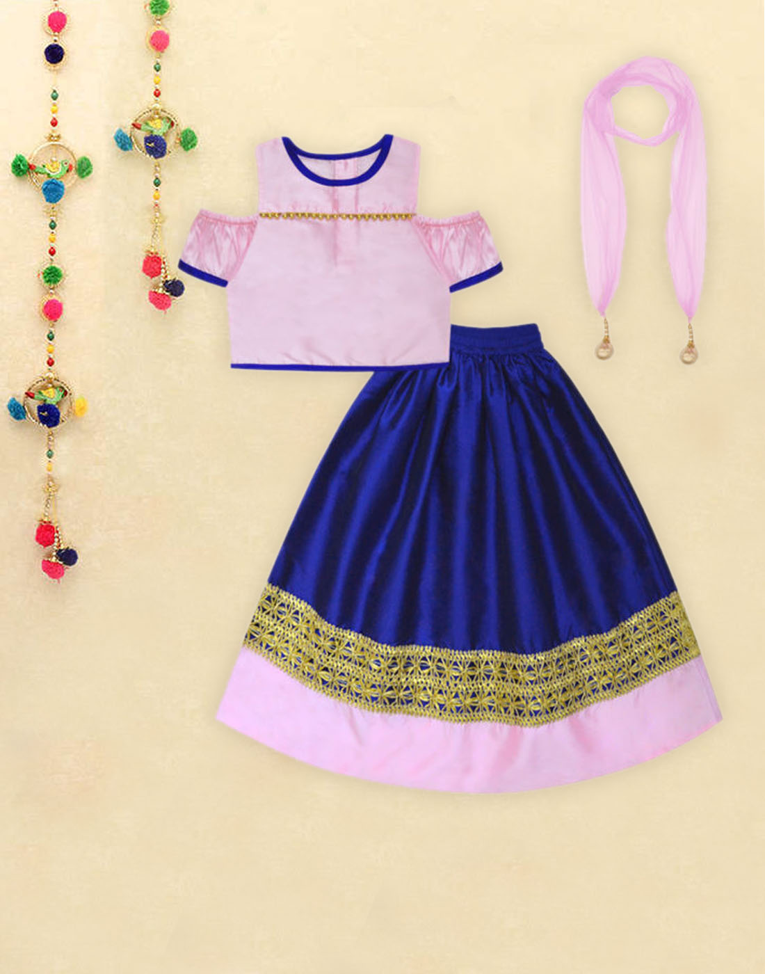Baby Pink-Royal Blue Cold-Shoulder Three Piece Lehenga Set
