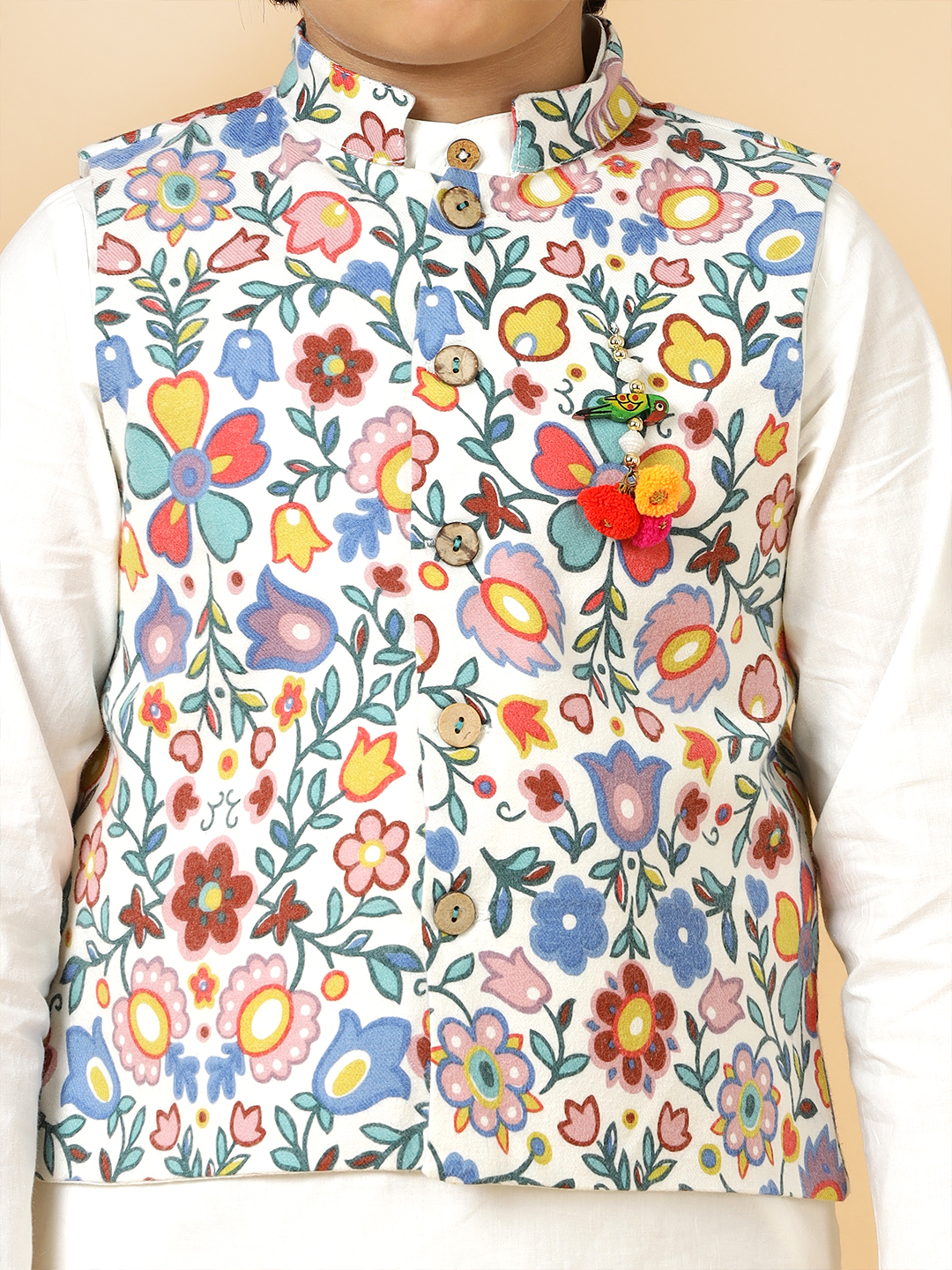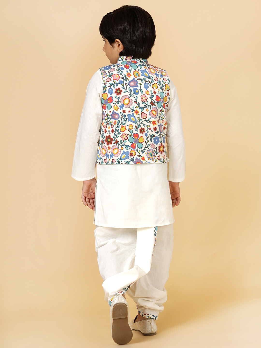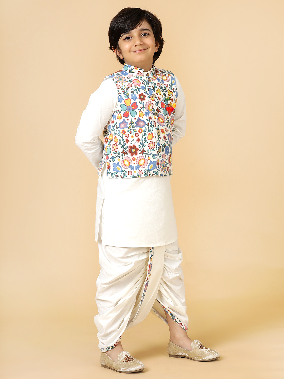 Festive time calls for the best for your little boy! This delightful Jacket Kurta Dhoti Set blends fun colours in a ethnic silhouette. Crafted with soft, breathable cotton fabric, the set features vibrant colours, perfect for a festive event. Its comfortable fit and stylish design make it an ideal choice for your little one’s wardrobe this festive season.