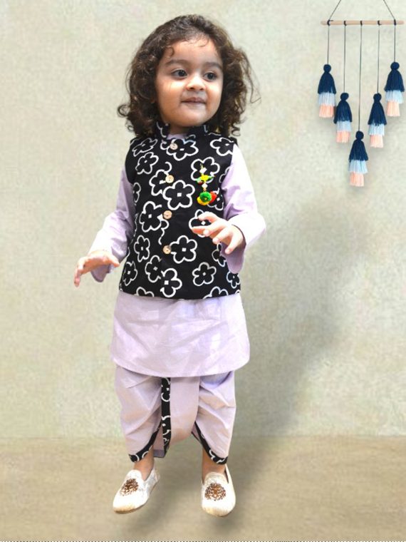 Festive time calls for the best for your little boy! This delightful Jacket Kurta Dhoti Set blends fun colours in a ethnic silhouette. Crafted with soft, breathable cotton fabric, the set features vibrant colours, perfect for a festive event. Its comfortable fit and stylish design make it an ideal choice for your little one’s wardrobe this festive season.