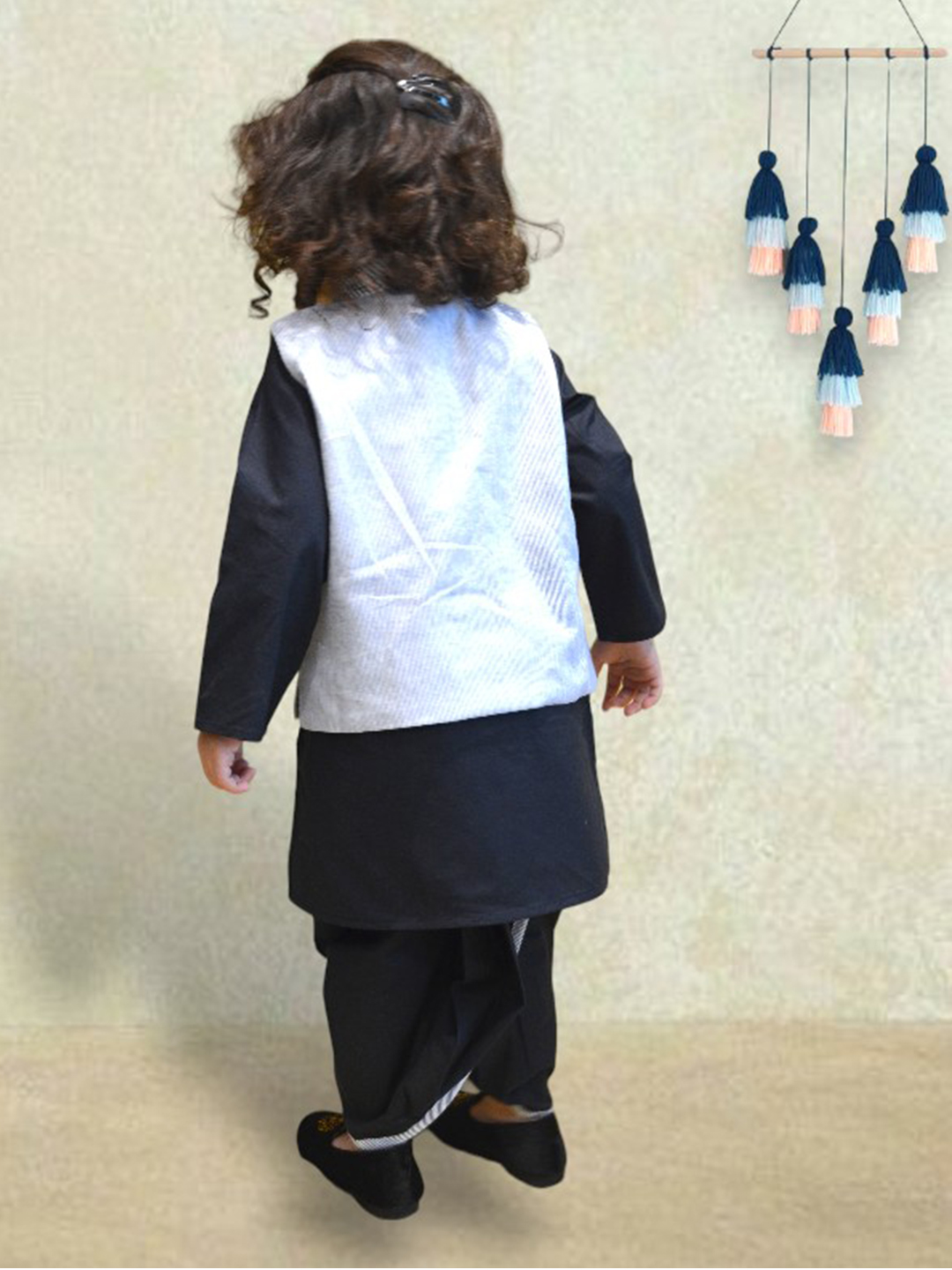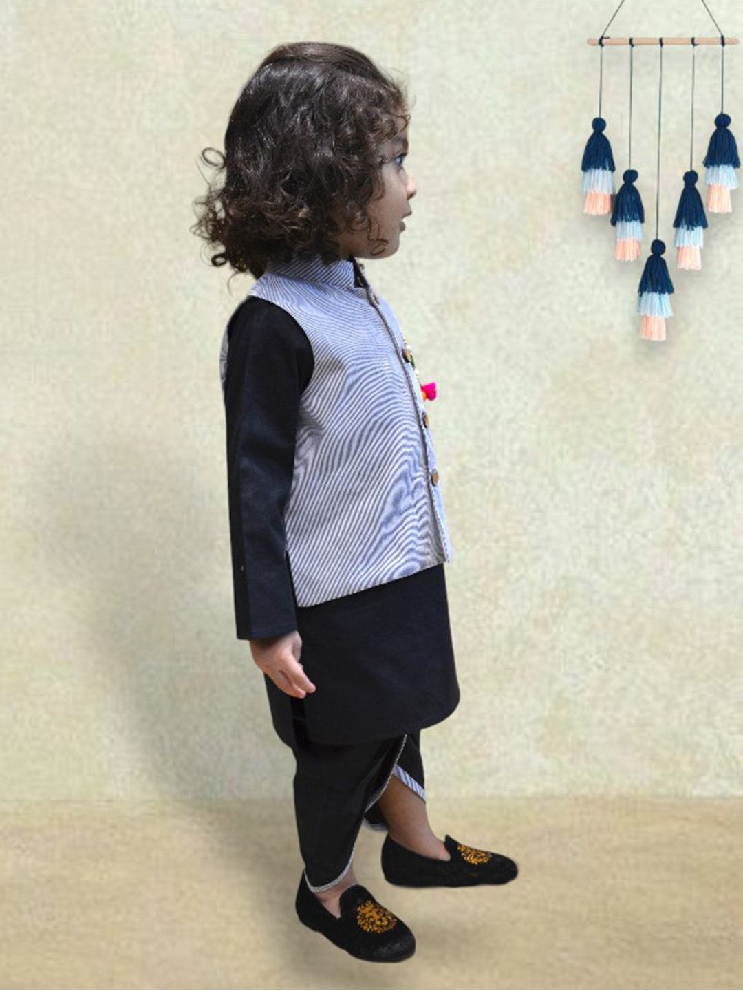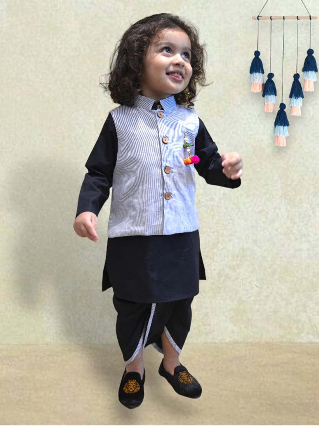 Festive time calls for the best for your little boy! This delightful Jacket Kurta Dhoti Set blends fun colours in a ethnic silhouette. Crafted with soft, breathable cotton fabric, the set features vibrant colours, perfect for a festive event. Its comfortable fit and stylish design make it an ideal choice for your little one’s wardrobe this festive season.