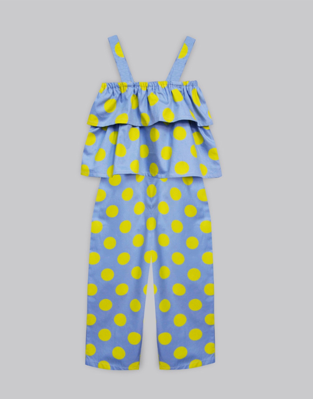 Season’s delight for your little girl! A lovely jumpsuit for that playday! Ruffle detailing and elastic along the chest make it the right choice with a comfort fit for all day wear.