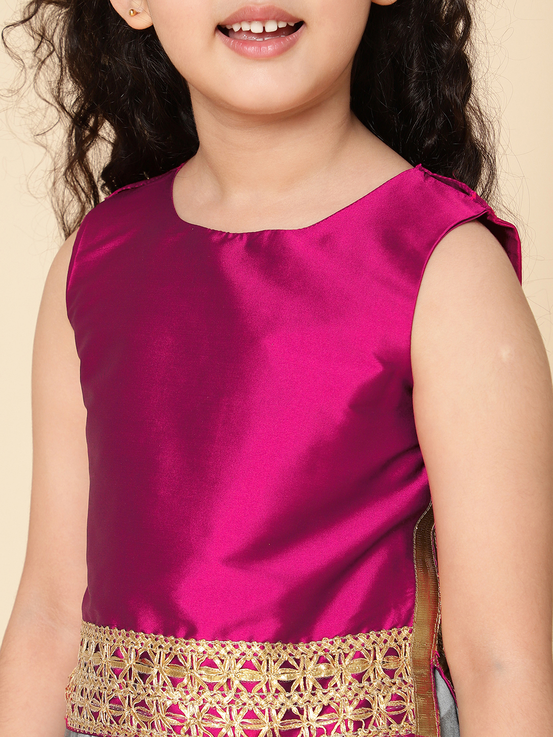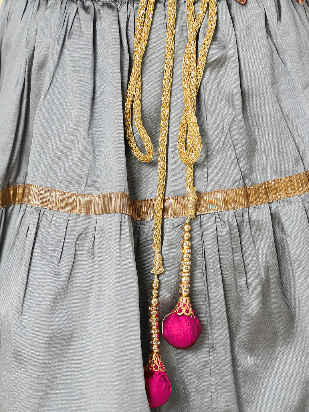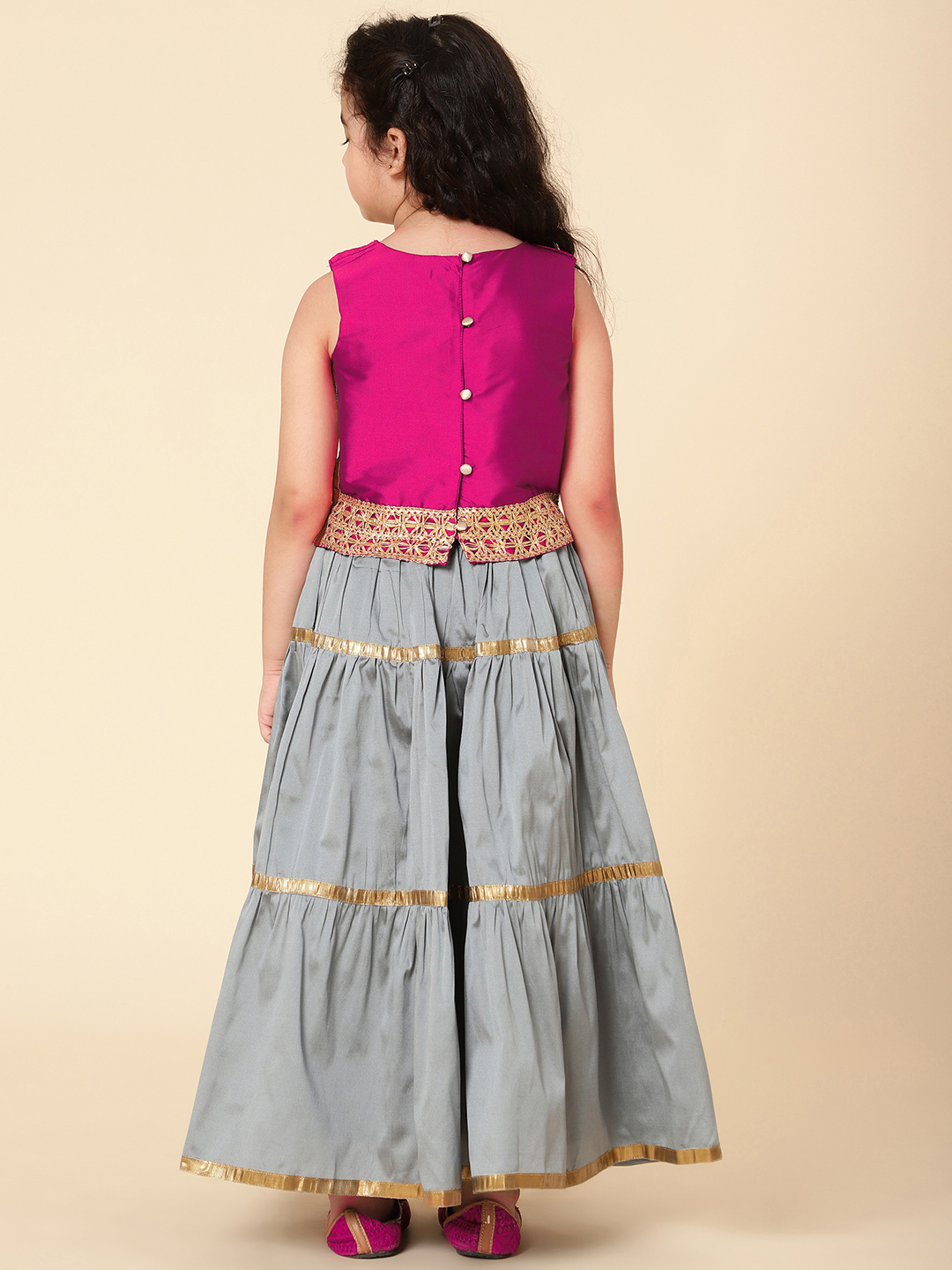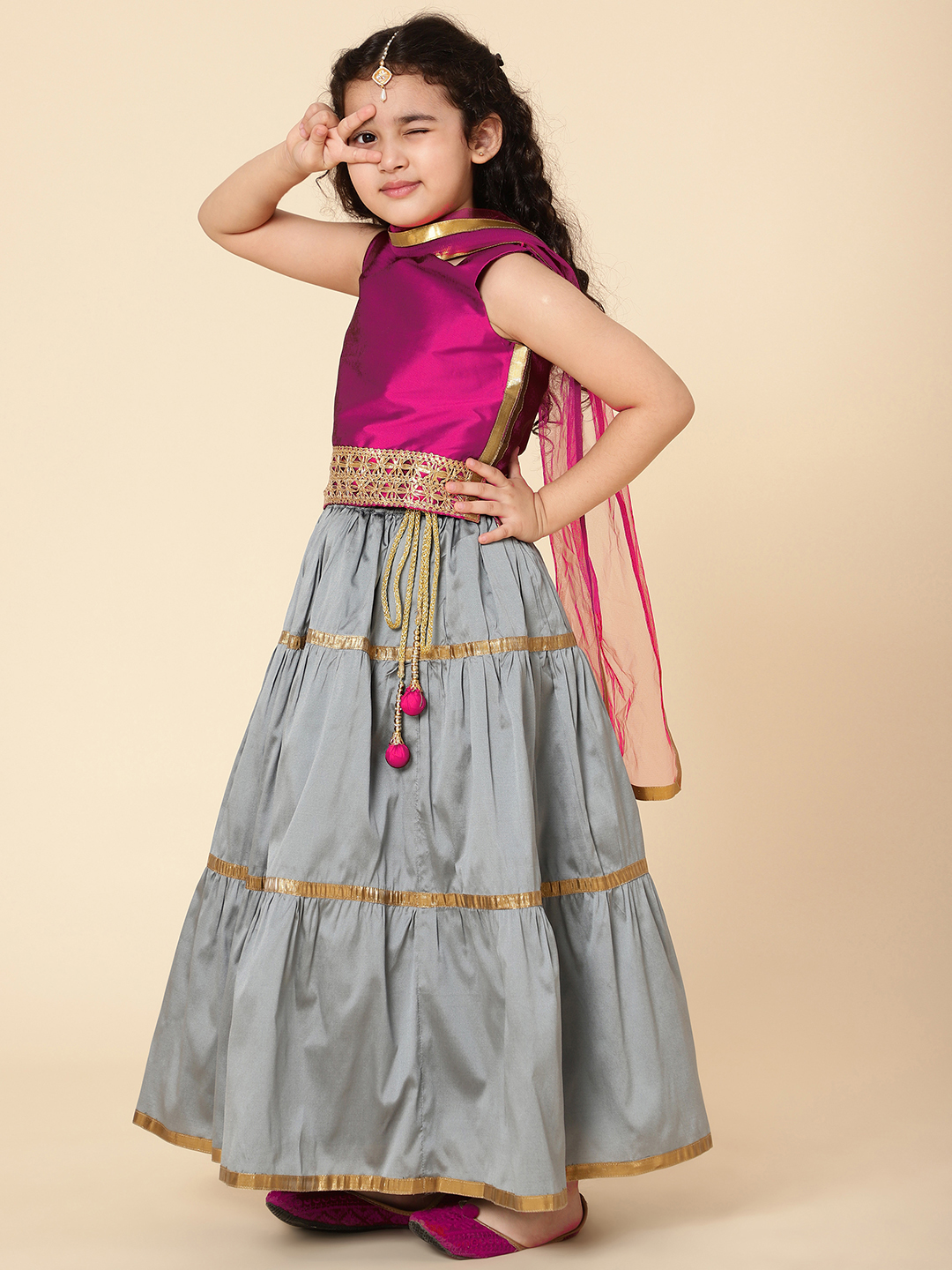 A never-like-before style for your little fashionistas coming along, perfect for festivals & weddings! This lehenga set by A.T.U.N. will be perfect for her. Contrasting colors blended in a combination so elegant, with gota lace beautifully used along the tiered lehenga and the bottom hem of the top. Not to miss out on the epaulettes on the top, so your little one can easily tuck her dupatta in them and an elasticated lehenga waist for a comfort fit. She will surely love this stylish yet comfortable lehenga set.