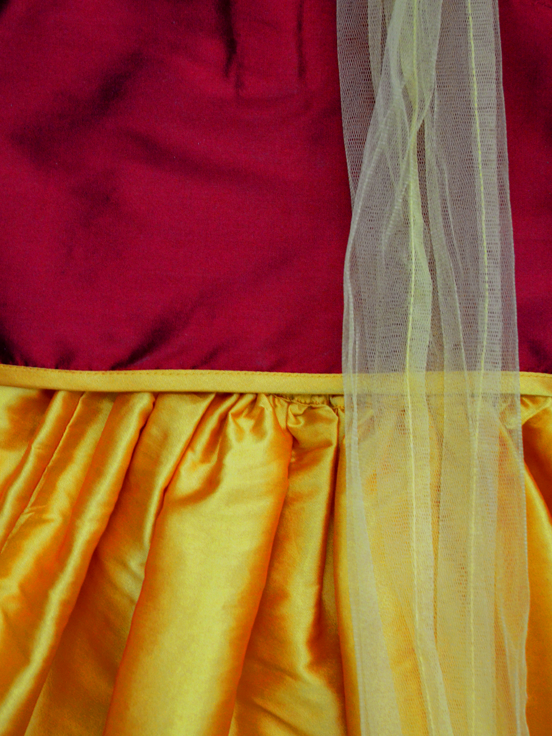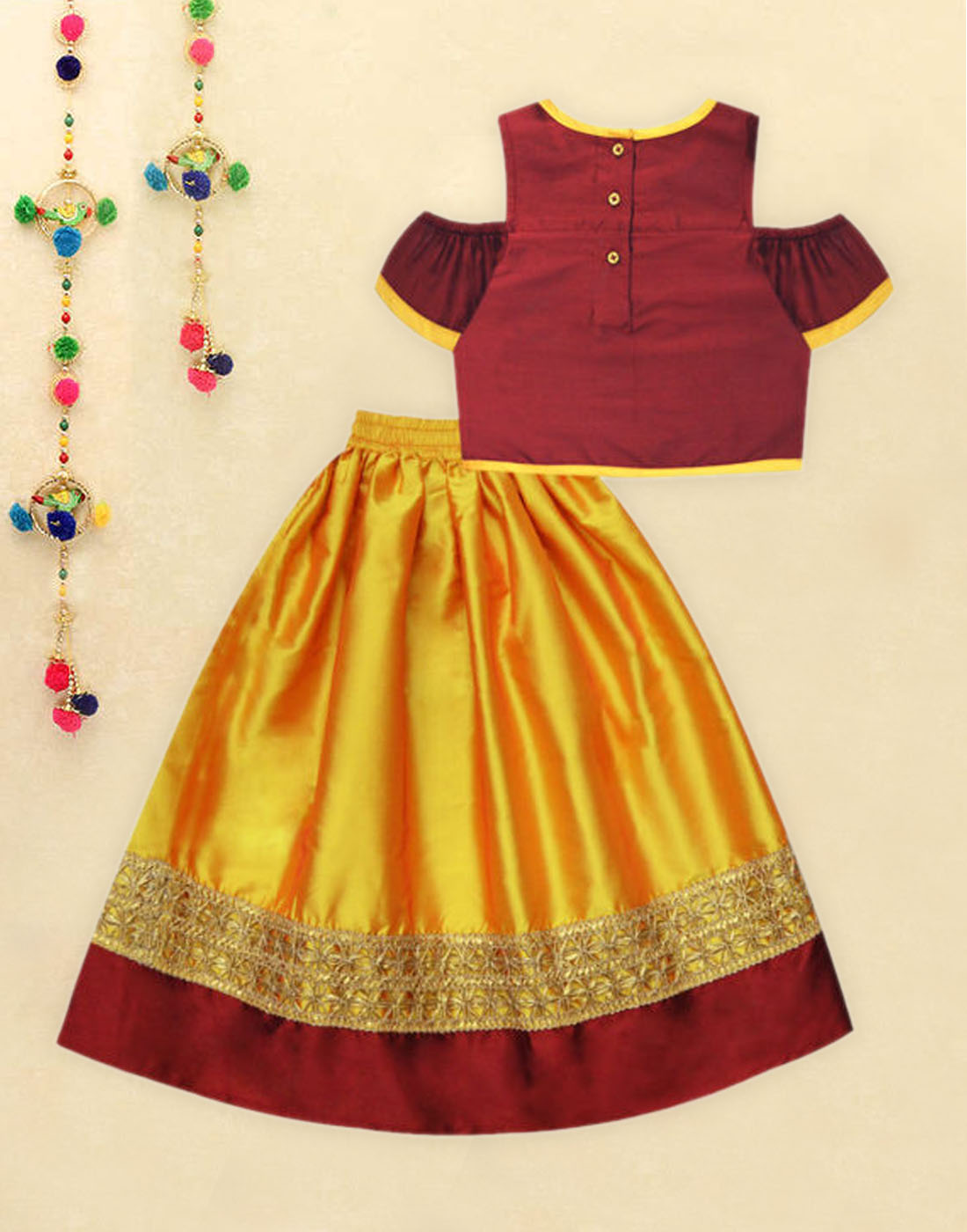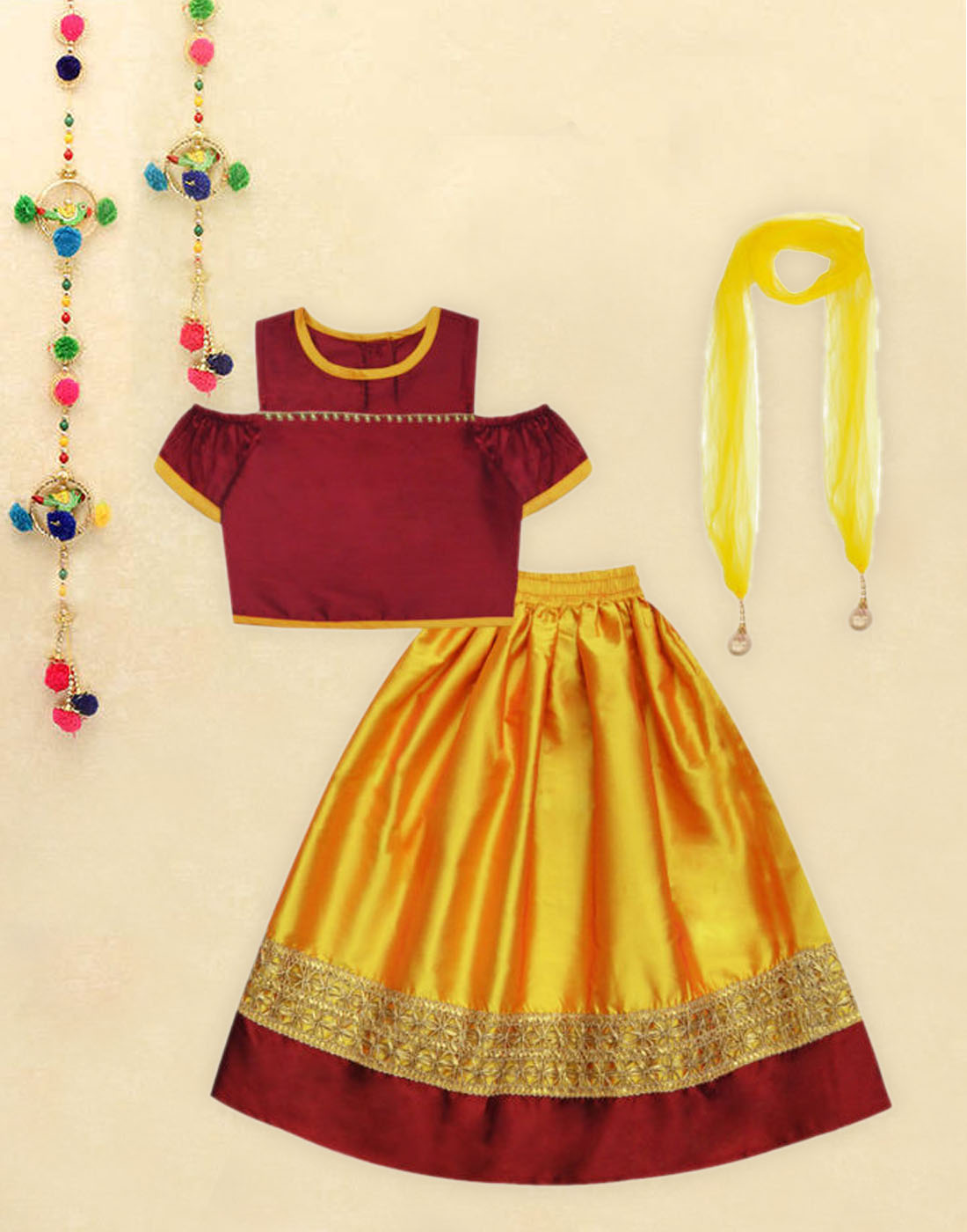 Maroon-Amber Cold-Shoulder Three Piece Lehenga Set