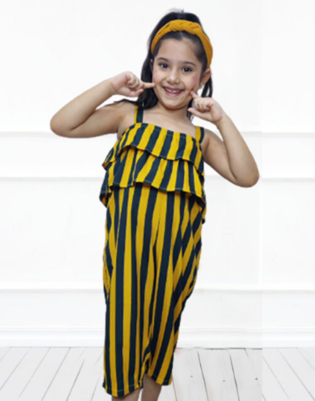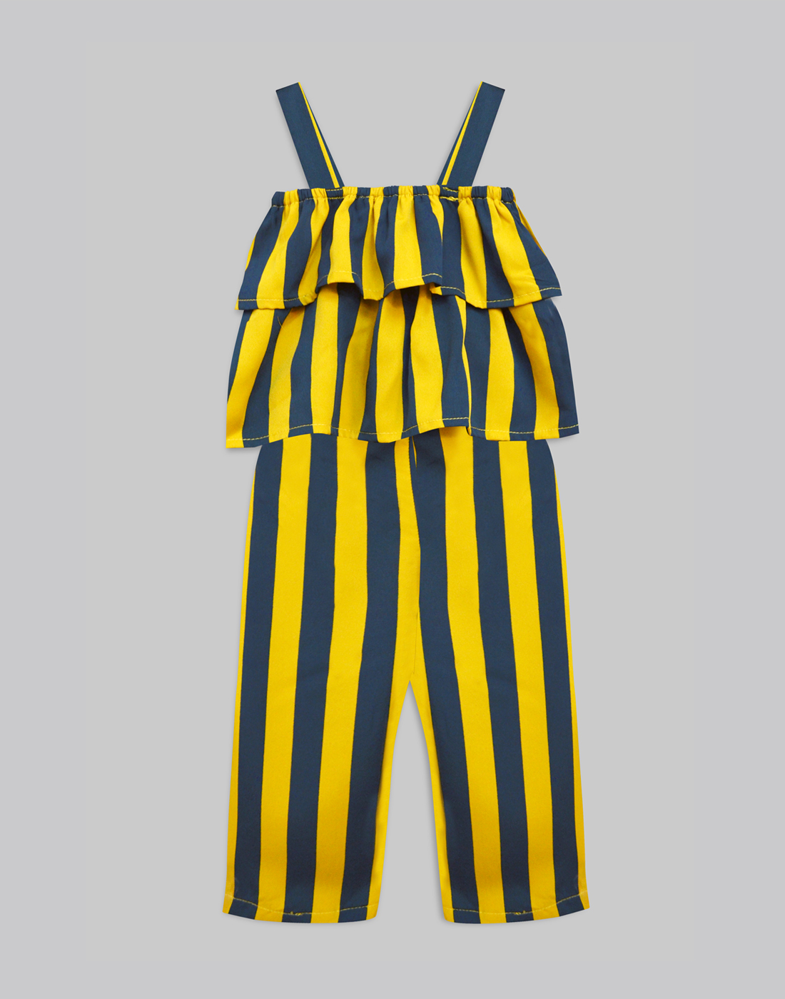 Season’s delight for your little girl! A lovely jumpsuit for that playday! Ruffle detailing and elastic along the chest make it the right choice with a comfort fit for all day wear.