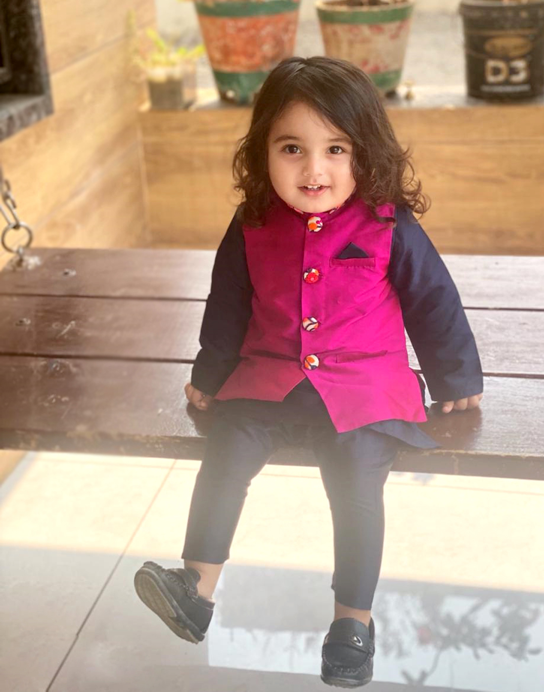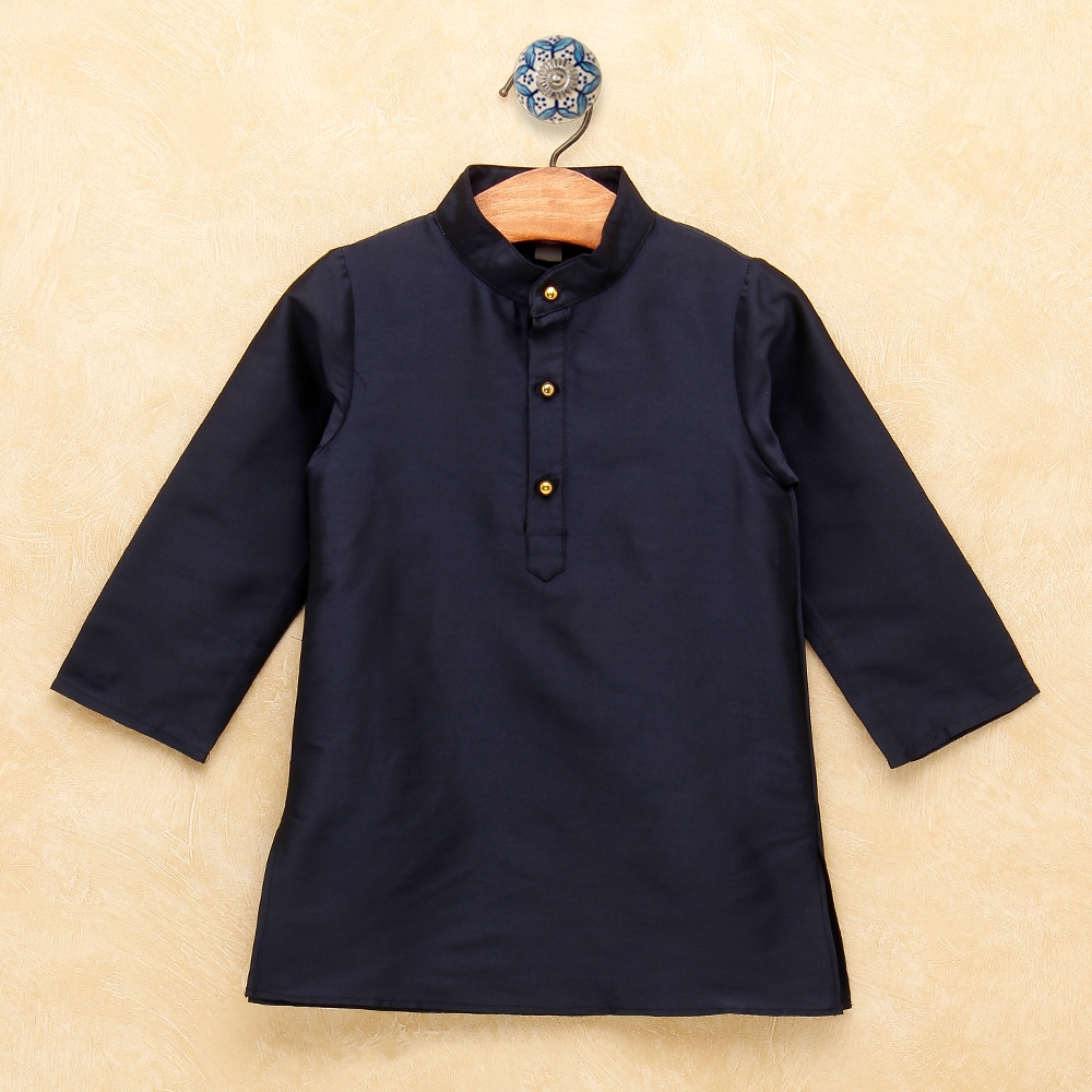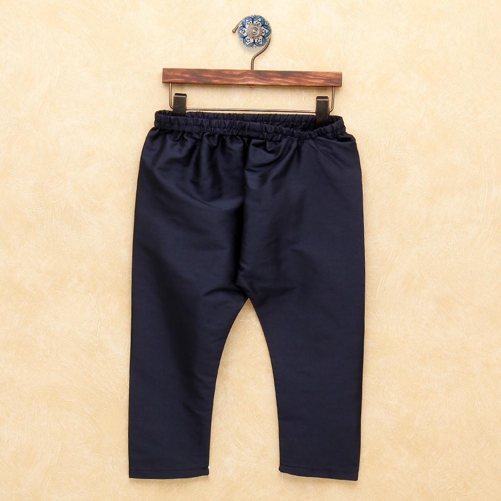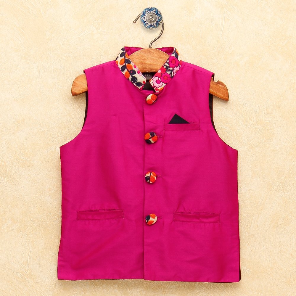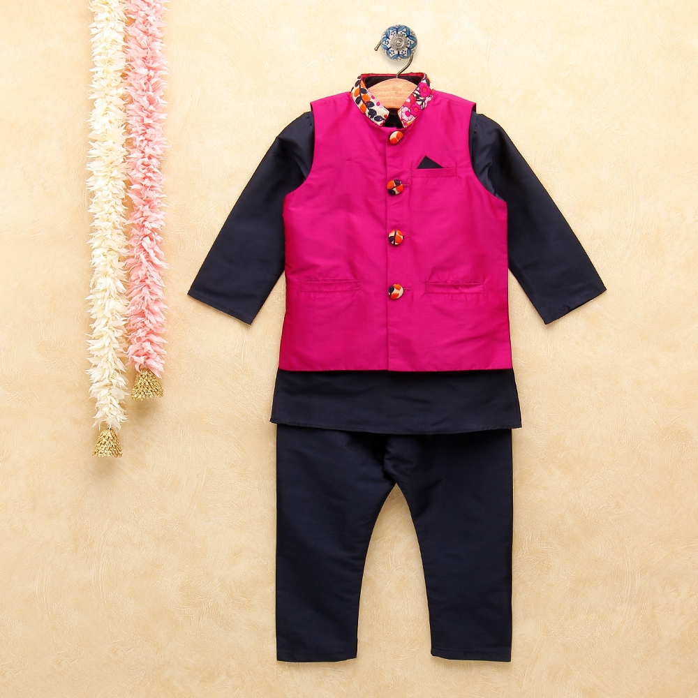 One of a kind style for your little masters! This Kurta-Pants-Jacket set designed by A.T.U.N. is the perfect Indian wear for him. Stylish Nehru Jacket with embroidered collars enhance the look and the taffeta pocket square adds style quotient . And a pair of straight pants that completes the look of the style making it a must-have occassion wear for your little boy.