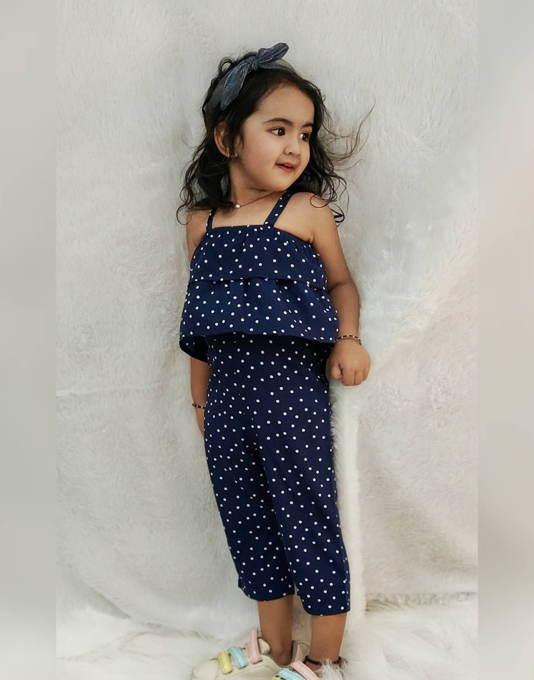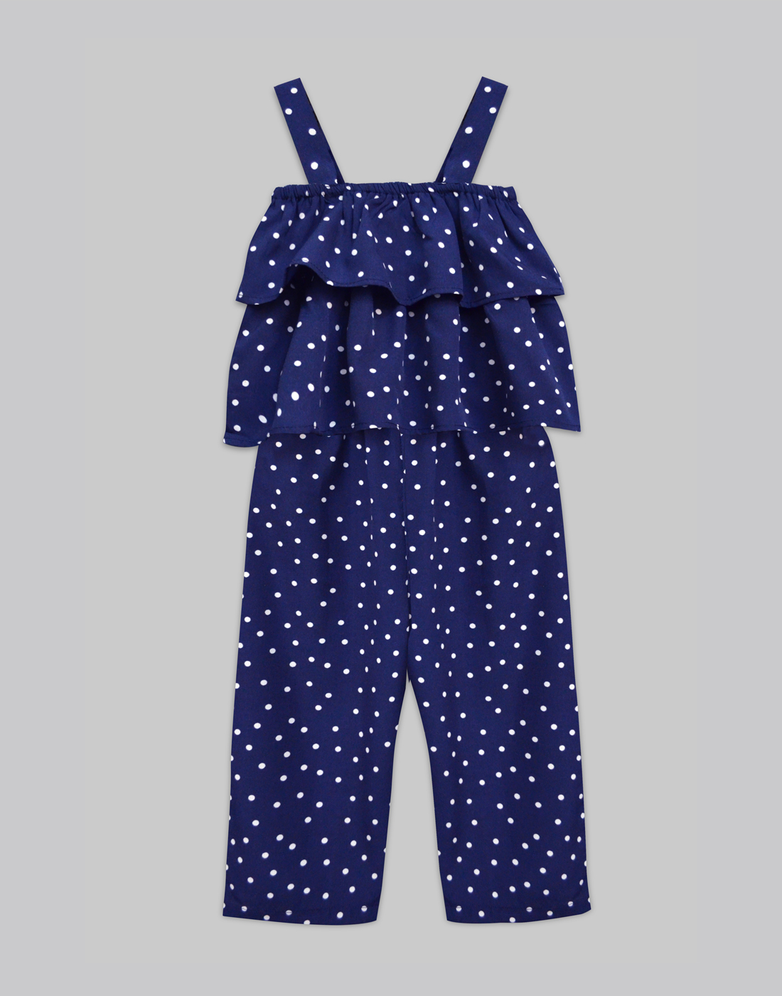 Season’s delight for your little girl! A lovely jumpsuit for that playday! Ruffle detailing and elastic along the chest make it the right choice with a comfort fit for all day wear.