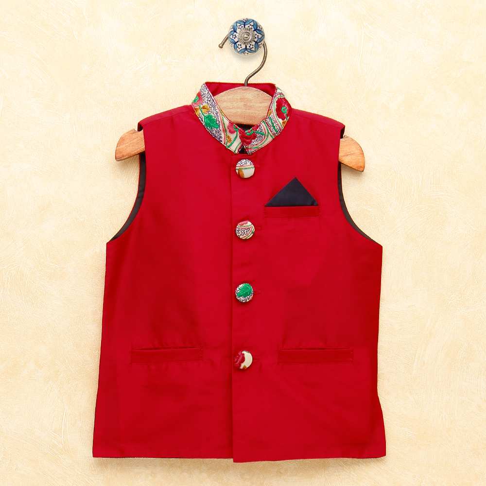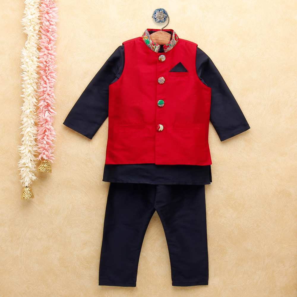 One of a kind style for your little masters! This Kurta-Pants-Jacket set designed by A.T.U.N. is the perfect Indian wear for him. Stylish Nehru Jacket with embroidered collars enhance the look and the taffeta pocket square adds style quotient . And a pair of straight pants that completes the look of the style making it a must-have occassion wear for your little boy.