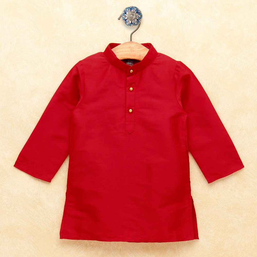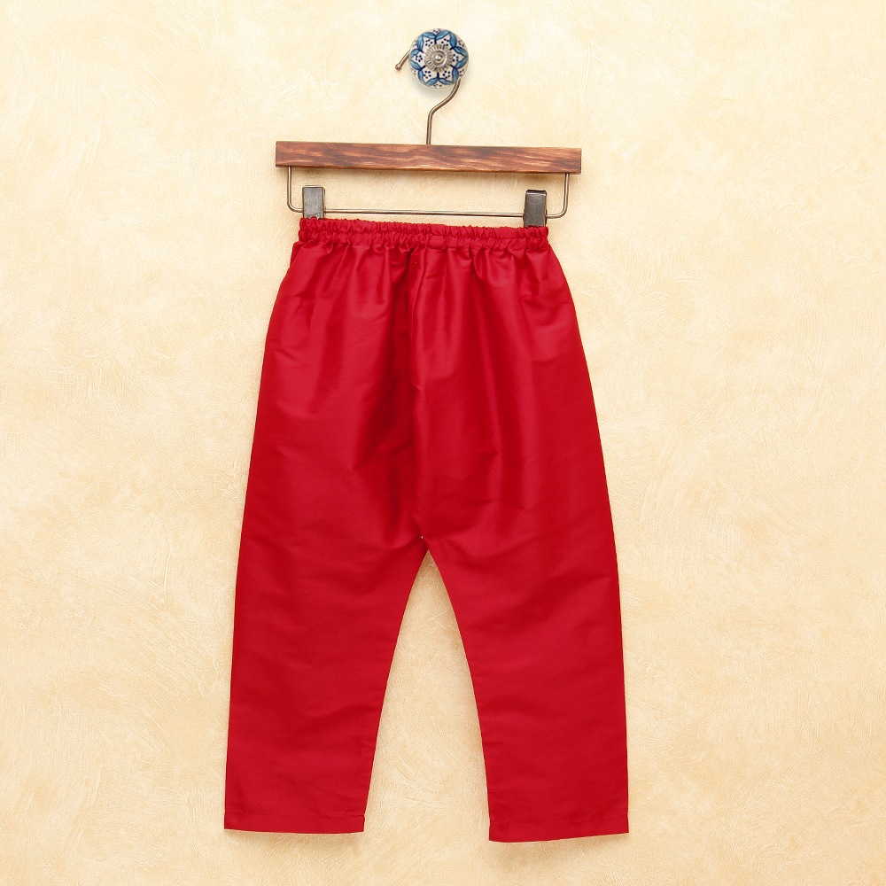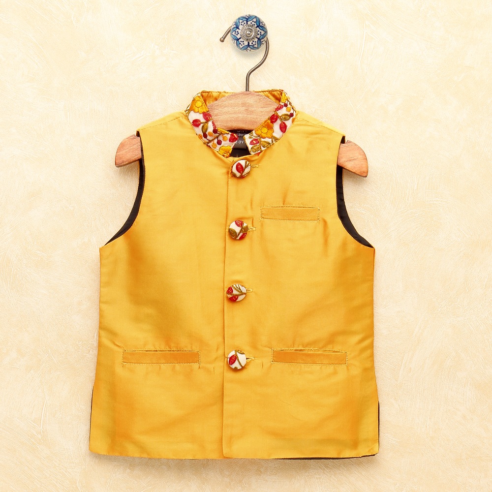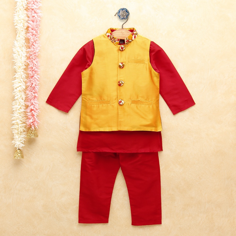 One of a kind style for your little masters! This Kurta-Pants-Jacket set designed by A.T.U.N. is the perfect Indian wear for him. Stylish Nehru Jacket with embroidered collars enhance the look and the taffeta pocket square adds style quotient . And a pair of straight pants that completes the look of the style making it a must-have occassion wear for your little boy.