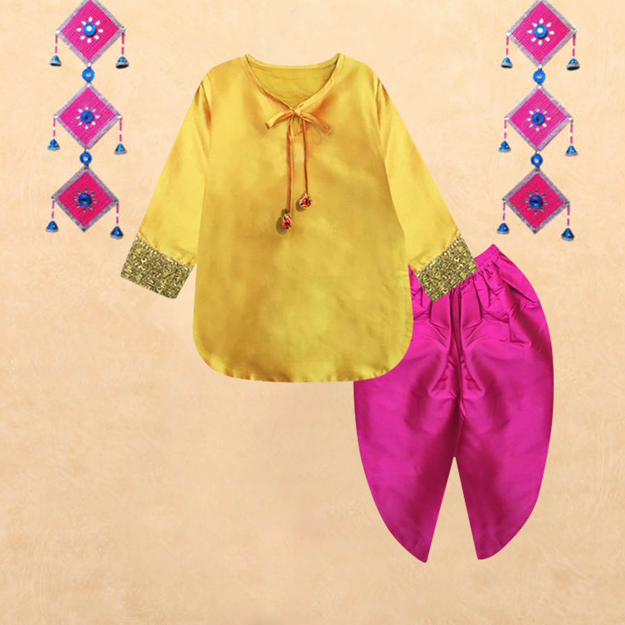 Presenting to your little one, the ever-so ethereal Shaziya Dhoti-Kurta Set. It’s comfortable, stylish and definitely the perfect Indianwear that your little munchkin would love to be in.