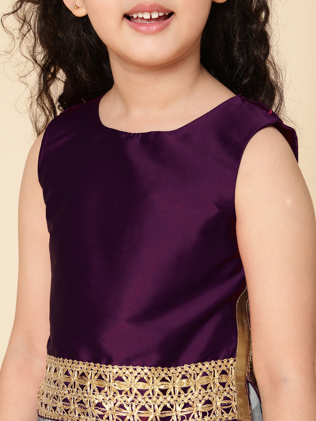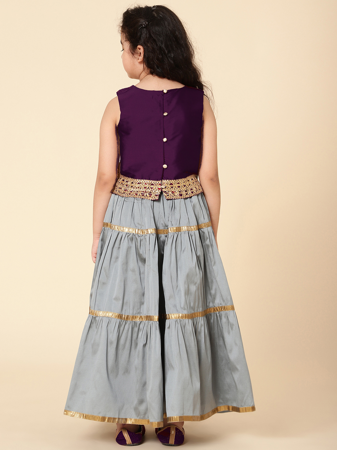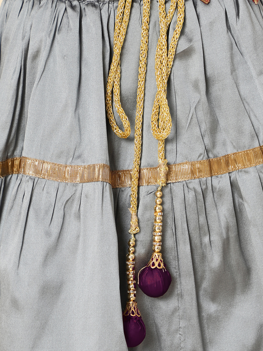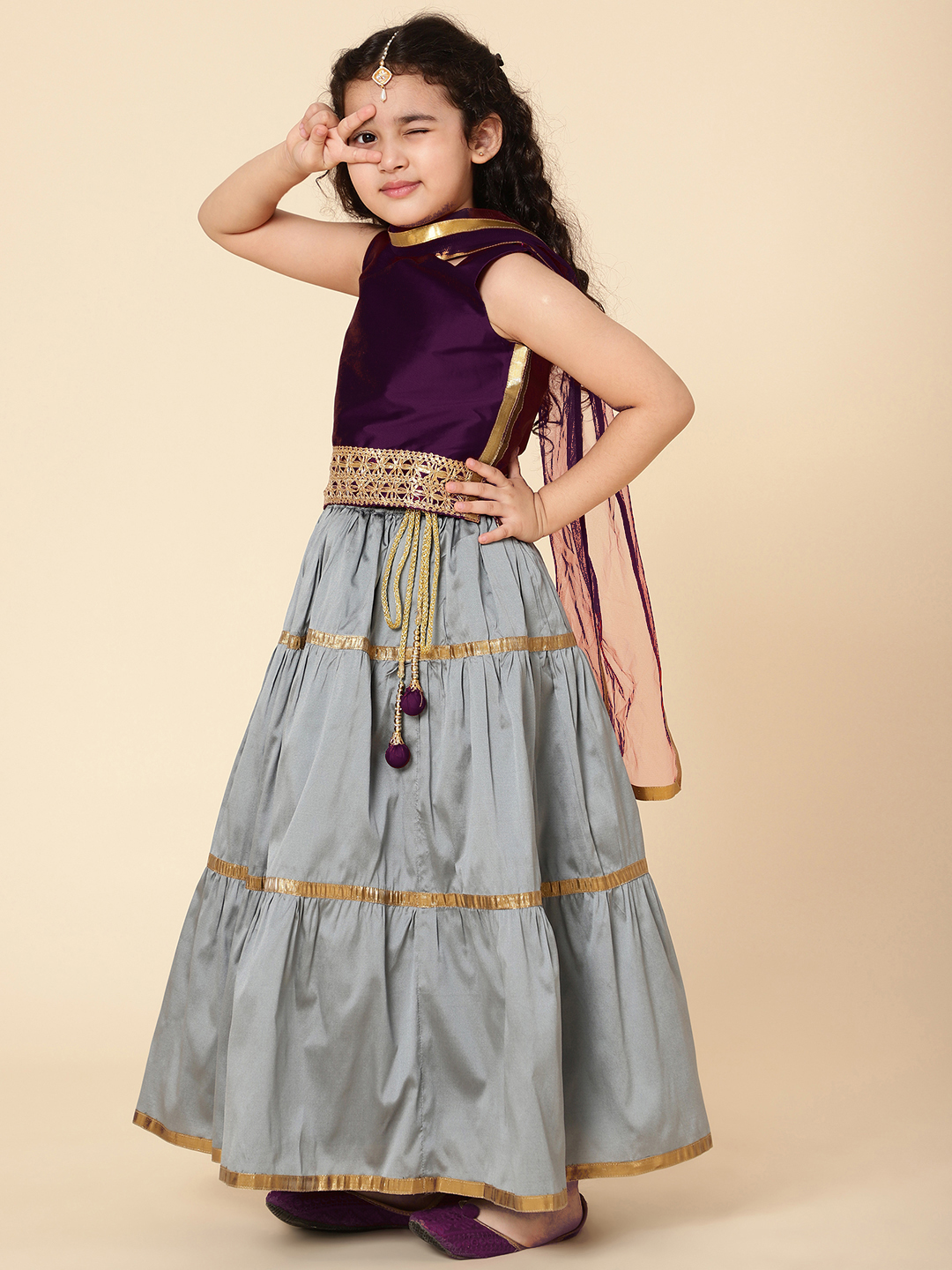 A never-like-before style for your little fashionistas coming along, perfect for festivals & weddings! This lehenga set by A.T.U.N. will be perfect for her. Contrasting colors blended in a combination so elegant, with gota lace beautifully used along the tiered lehenga and the bottom hem of the top. Not to miss out on the epaulettes on the top, so your little one can easily tuck her dupatta in them and an elasticated lehenga waist for a comfort fit. She will surely love this stylish yet comfortable lehenga set.