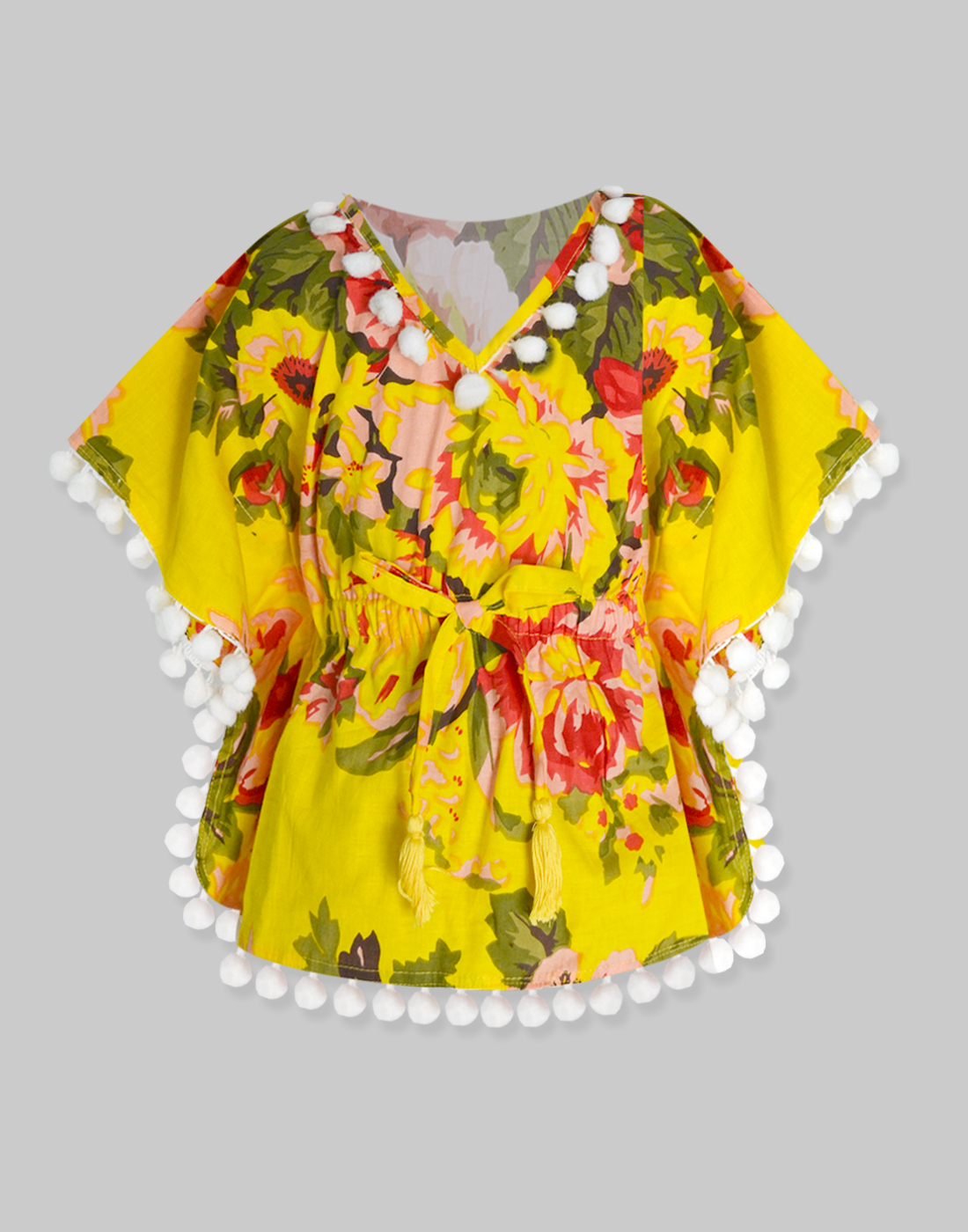 The easy-breezy kaftan top style! This kaftan comes with pretty pompom detailing and a flattering, comfy fit. Adorable tassels and an elasticated waist for an easy and comfortable fit.